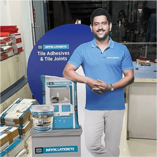 - Life-like cutouts of M.S. Dhoni with MYK Laticrete products.